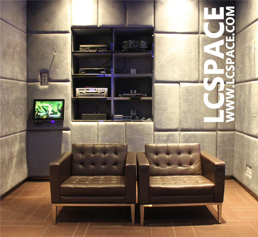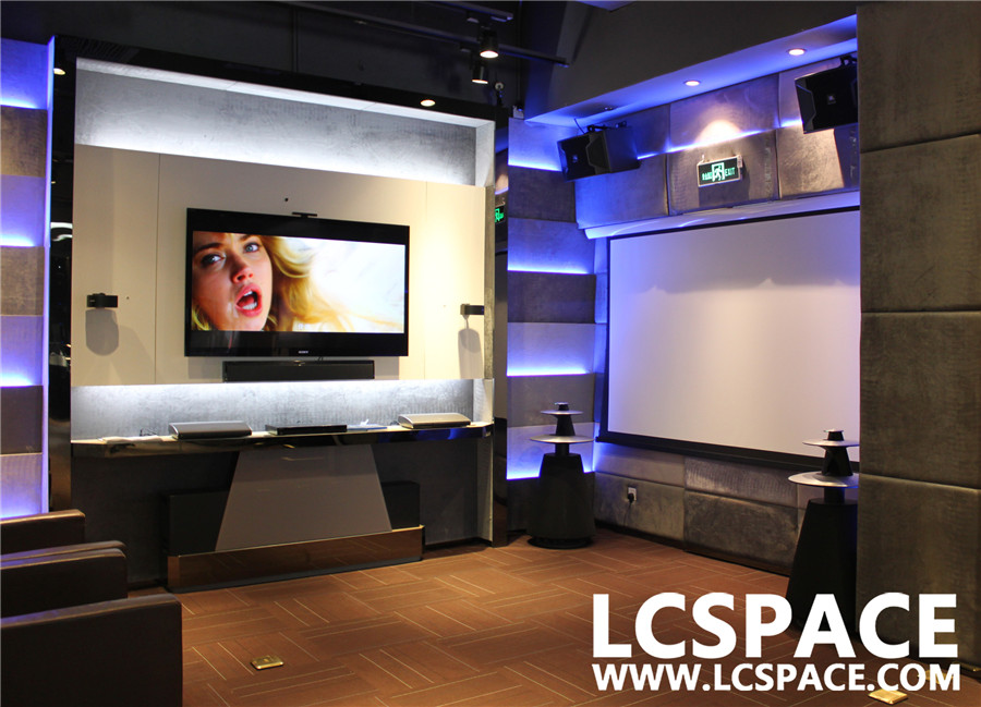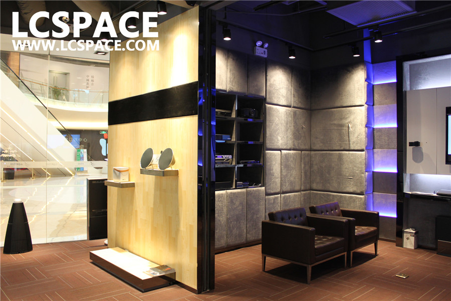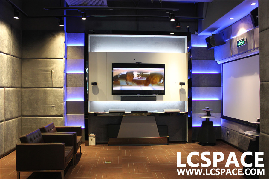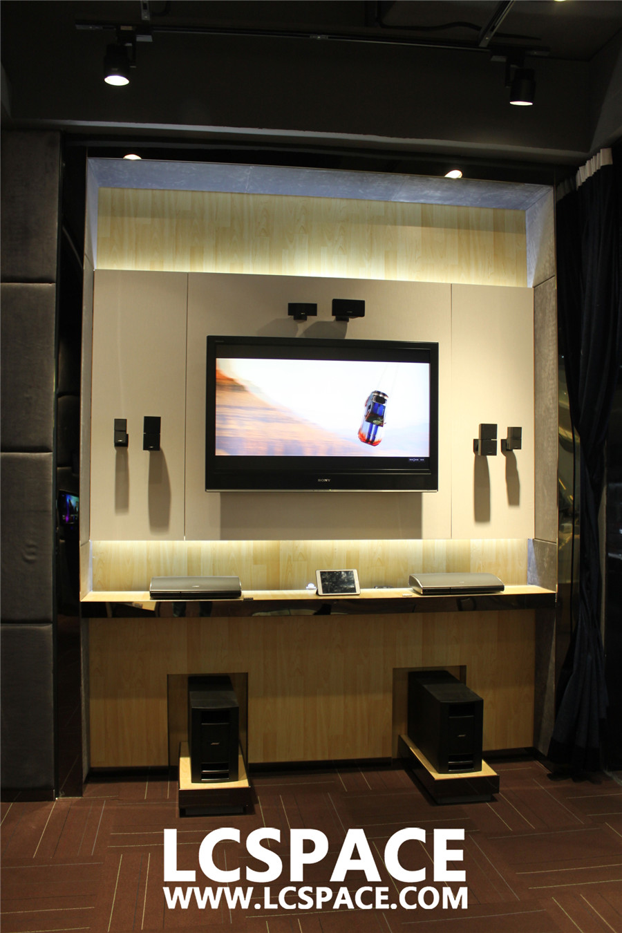。弧形的格局,弧形的LOGO造型吊顶,通过黑色烤漆,不锈钢边框,木地板、软包背景,及局部壁纸等材质的整体搭配,LED灯光渲染,简约间显露大气风范。