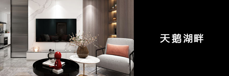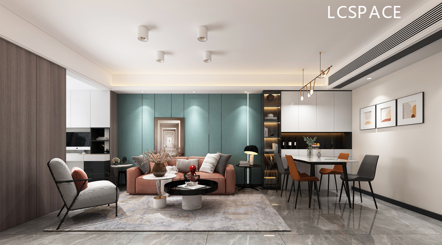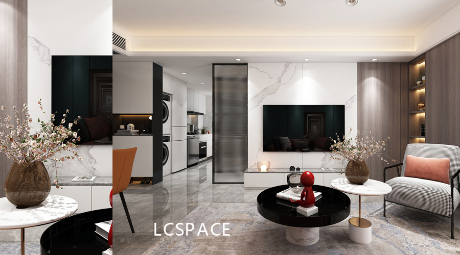电视及厨房空间,连通一体,房间门暗藏处理,融入装饰壁柜。