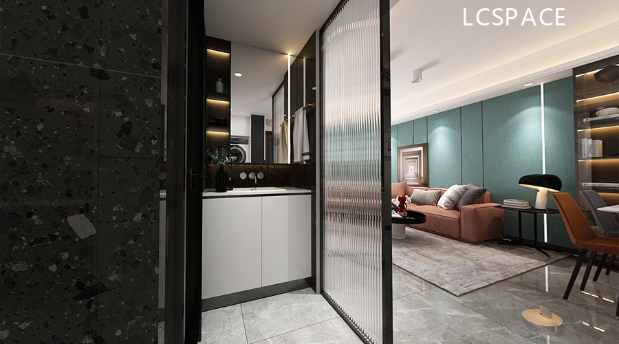 开放的公卫洗手台位置,通过长虹玻璃屏风隔断。